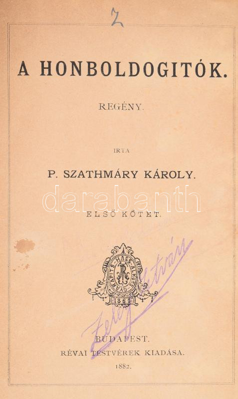 P. Szathmáry Károly: A honboldogítók. Első kötet. Bp., 1882, Révai. Fé... https://www.darabanth.com/hu/504-Gyorsarveres/504.0/Konyvek/Konyvek-Egyeb-ritkasagok~2500040/P-Szathmary-Karoly-A-honboldogitok-Elso-kotet-Bp-1882-Revai-Felvaszon-kotes-kopo~II3404759