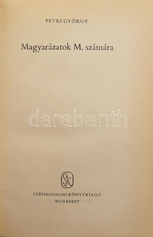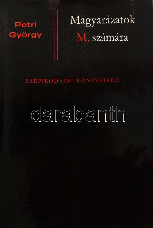 Petri György: Magyarázatok M. számára. Budapest, [1971], Szépirodalmi Könyvkiadó, [Alföldi Nyomda, Debrecen], 131 p. Kiadói papírkötésben, eredeti papír védőborítóval. A költő fényképét Bence György (1941-2006) filozófus készítette. Megjelent 1500 példányban. Első kiadás! A költő első kötete!
