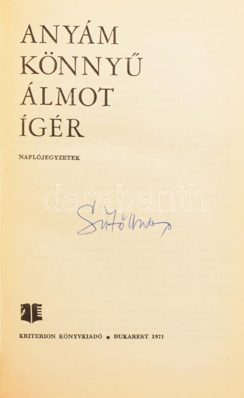 Sütő András: Anyám könnyű álmot ígér. ALÁÍRT ! Bukarest, 1971, Kriteri... https://www.darabanth.com/hu/504-Gyorsarveres/504.0/Konyvek/Konyvek-Egyeb-ritkasagok~2500040/Suto-Andras-Anyam-konnyu-almot-iger-ALAIRT-Bukarest-1971-Kriterion-1-kiadas-Kia~II3420044