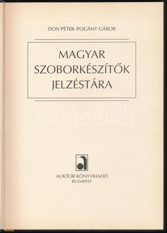 Don Péter - Pogány Gábor: Magyar szoborkészítők jelzéstára. Bp., 2003,... https://www.darabanth.com/hu/504-Gyorsarveres/504.0/Konyvek/Konyvek-Epiteszet-muveszet~2500026/Don-Peter-Pogany-Gabor-Magyar-szoborkeszitok-jelzestara-Bp-2003-Auktor-141plus3-p-Ki~II3400853