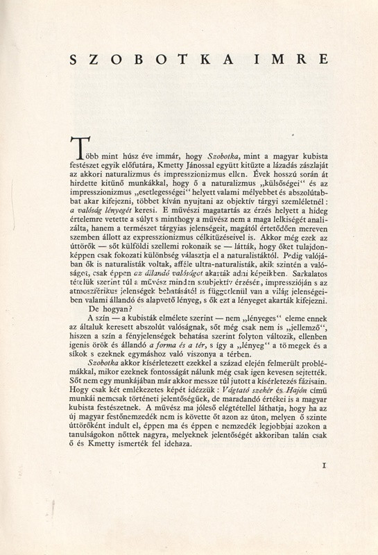 Szobotka Imre festőművész, grafikus (1890-1961), az Iparművészeti Iskolában Ujváry Ignác tanítványa volt. Velencei, római és párizsi tanulmányok után 1919-ben tért haza. Festészetében a párizsi kubizmus tapasztalatát ötvözi a nagybányai hagyományokkal. Több hazai kiállítás után 1938. március 13-a és 1938. március 27-e között mutatkozott be a budapesti Fränkel Szalonban. A tárlaton a művész 34 festménye szerepelt; katalógusunkban hat alkotás reprodukciója szerepel, a festő munkásságát Rózsa Miklós méltatja.