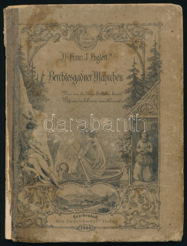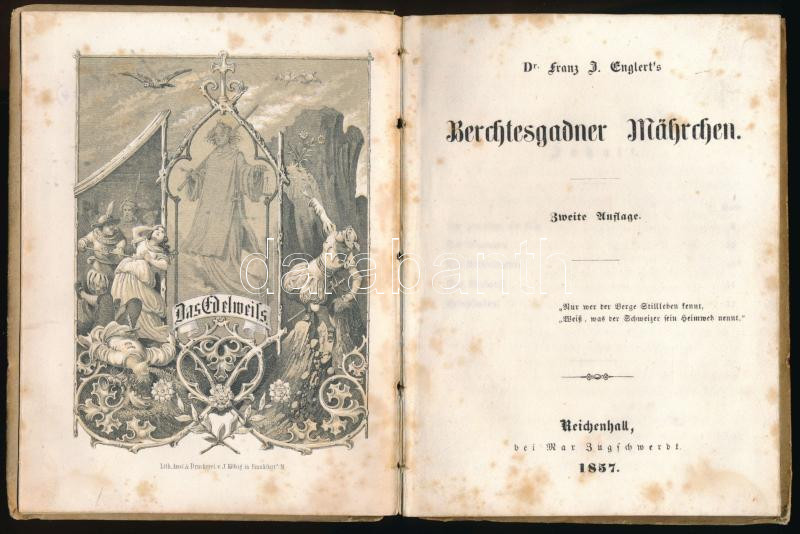 Leírás: Englert, Franz J.: Berchtesgadner Mährchen. Reichenhall, 1857, Max Zugschwerdt, 1 t.+ 59+(1) p. Német nyelven. Kiadói kartonált papírkötés, viseltes, foltos borítóval, hiányzó gerinccel, foltos lapokkal, ajándékozási bejegyzéssel.