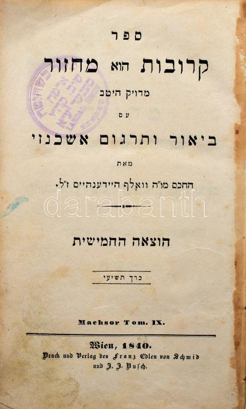 Machsor Tom. IX. [Mákzór izraelita imádságoskönyv.] Wien, 1840, Franz Edler von Schmid und J. J. Busch. Héber nyelven. Aranyozott félbőr-kötésben, viseltes, a könyvtesttől különvált borítóval, helyenként foltos lapokkal, "Landau Simon Szeged" bélyegzőkkel.