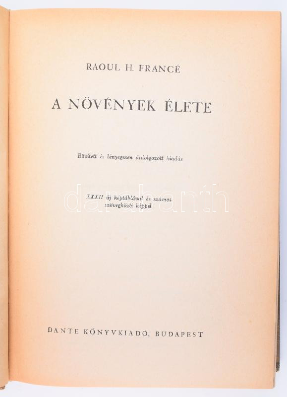 Leírás: Francé, Raoul H.: A növények élete. Fordította: Lambrecht Kálmán. Bp., 1942, Dante. Kiadói félvászon kötés, kissé kopottas állapotban.