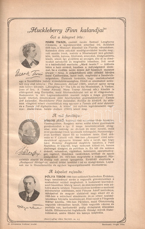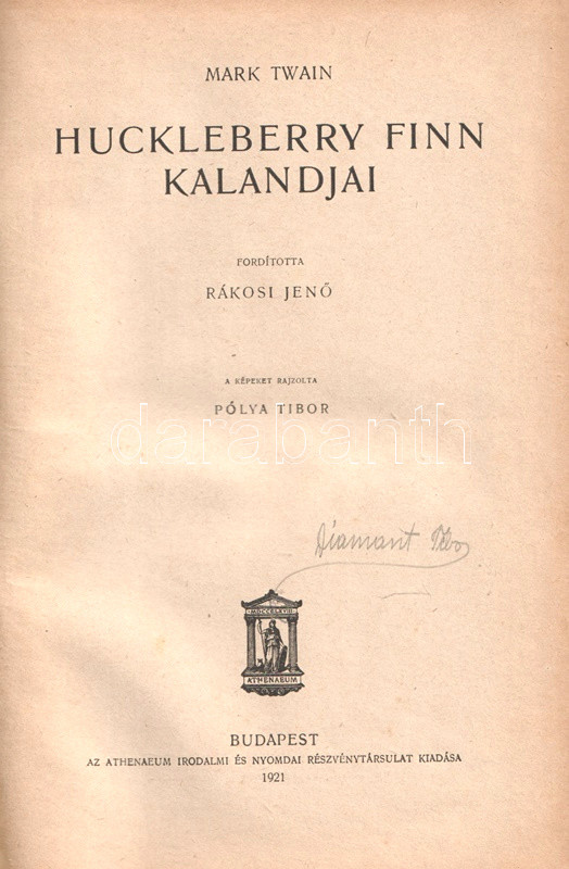 Huckleberry Finn kalandjai. Fordította: Rákosi Jenő. A képeket Pólya Tibor rajzolta.
