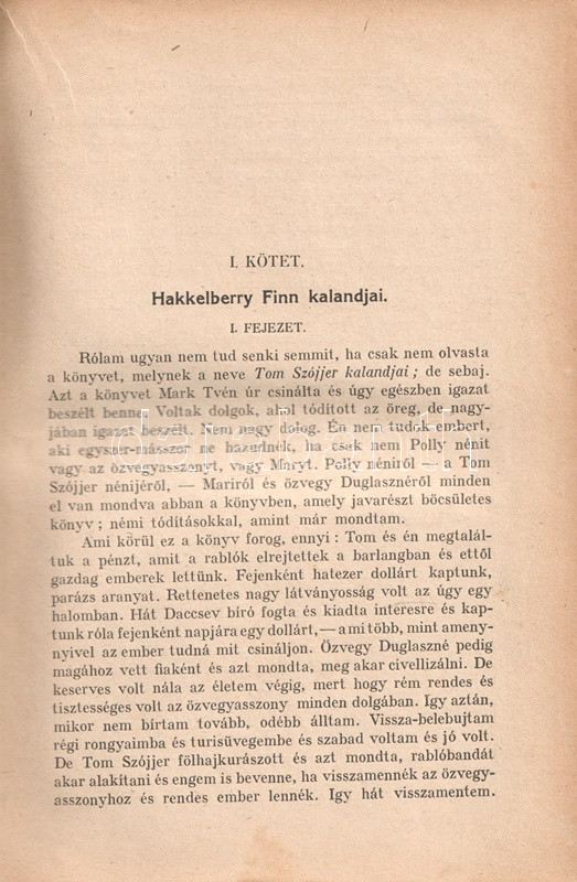 Mark Twain amerikai író (1835-1910) klasszikus regénye eredeti nyelven először 1884-ben jelent meg. A klasszikus amerikai regény magyarul először 1905-ben látott napvilágot, Kemény György fordításában, ezt követi kiadásunk, a Rákosi Jenő által fordított, Pólya Tibor egész oldalas grafikáival illusztrált verzió.