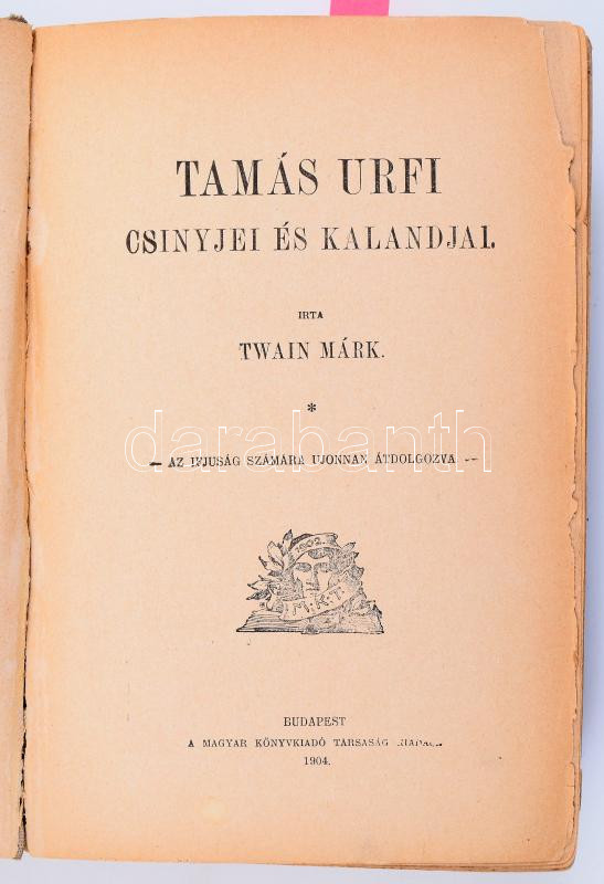 Twain, Mark: Tamás urfi csinyjei és kalandjai. + Huckleberry Finn vándorlásai és kalandjai. [Egy kötetben]. Bp., 1904-1905, Magyar Könyvkiadó Társaság, 176 p.; 193+(3) p. Kiadói egészvászon-kötés, kissé viseltes borítóval és gerinccel, tulajdonosi bejegyzésekkel és bélyegzőkkel, helyenként kissé sérült, foltos lapokkal.