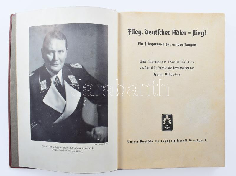 Orlovius, Heinz: Flieg, deutscher Adler - flieg! Unter Mitwirkung von Joachim Matthies und Kurt A. St. Jentkiewicz herausgegeben von - - . Stuttgart, 1939, Union Deutsche Verlagsgesellschaft, 1 t.+ 208+(4) p.+ 8 (kétoldalas) t. Fekete-fehér fotókkal illusztrálva. Német nyelven. Egészvászon-kötésben.