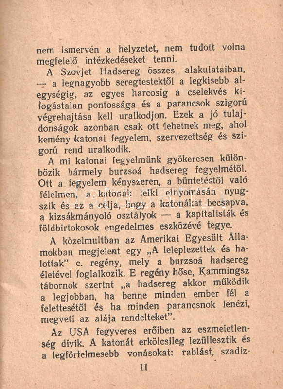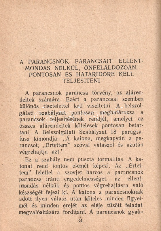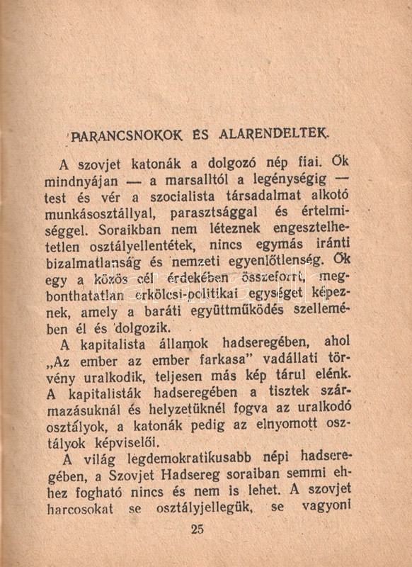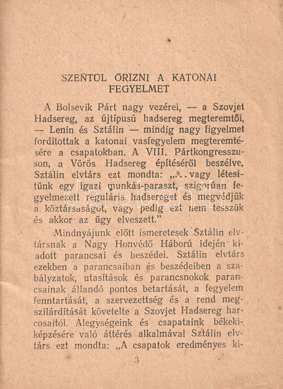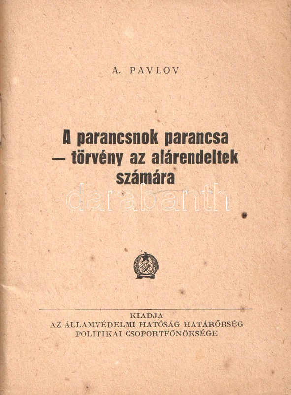 A kezdetektől a kommunista párt irányítása alatt álló erőszakszervezet, a Politikai Rendészeti Osztály 1945-ben alakult, 1946-ban felvette az Államvédelmi Osztály (ÁVO), majd 1948-tól az Államvédelmi Hatóság (ÁVH) nevet. A hat ügyosztályra tagozódó ÁVH 1948-től már határrendészeti feladatokkal is bírt. A Sztálin és a Szovjetunió dicsőítésére minden eszközt megragadó utasítás vasfegyelmet szorgalmaz, összehasonlítja a morál nélküli, erőszakra és zsákmányszerzésre épülő amerikai hadsereg-szervezést a Vörös Hadsereg kimagasló kötelességtudásával és morális alapállásával, valamint számos épületes anekdotát oszt meg a Vörös Hadsereg legendáriumából. Évszám nélkül megjelent kiadványunk egy ízben idézi a Szovjetunió Legfelsőbb Tanácsa elnökségének 1950. április 13-i rendeletét, kötetünk kiadási évét ennek az adatnak felhasználásával becsültük meg.