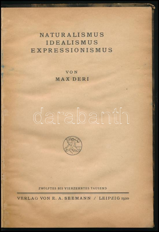 Leírás: Deri, Max: Naturalismus, Idealismus, Expressionismus. Leipzig, 1920, Verlag von Seemann. Félvászon kötés, kopottas állapotban.
