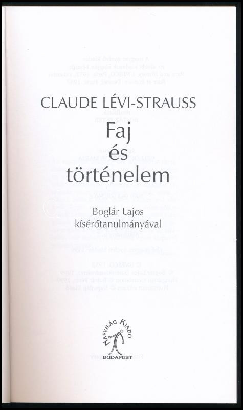 Lévi-Strauss, Claude: Faj és történelem. Boglár Lajos kísérőtanulmányával. Ford.: Bojtár Péter. Bp., 1999, Napvilág, 104+(4) p. Kiadói papírkötés, jó állapotban.