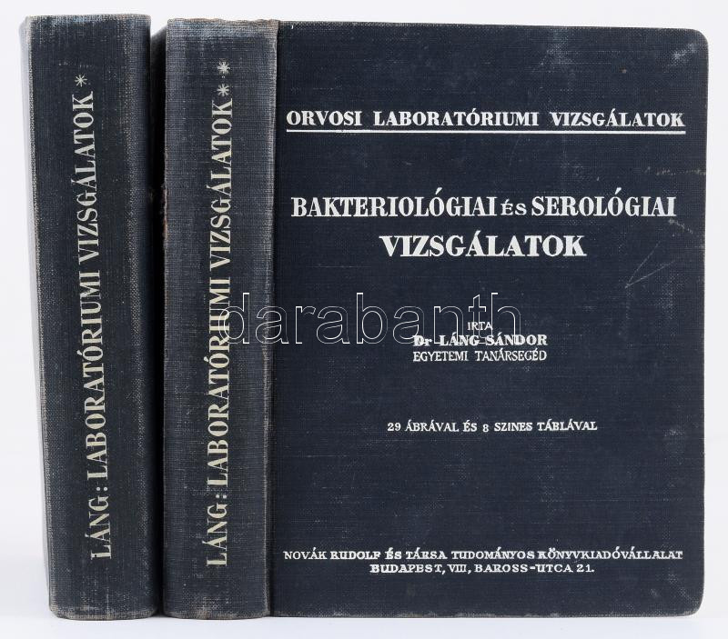 Dr. Láng Sándor: Orvosi laboratóriumi vizsgálatok I-II. Vegyi és mikroszkópos vizsgálatok. Bakteriológiai és serológiai vizsgálatok. Bp., 1941, novák Rudolf és Társa, kopott egészvászon kötés.