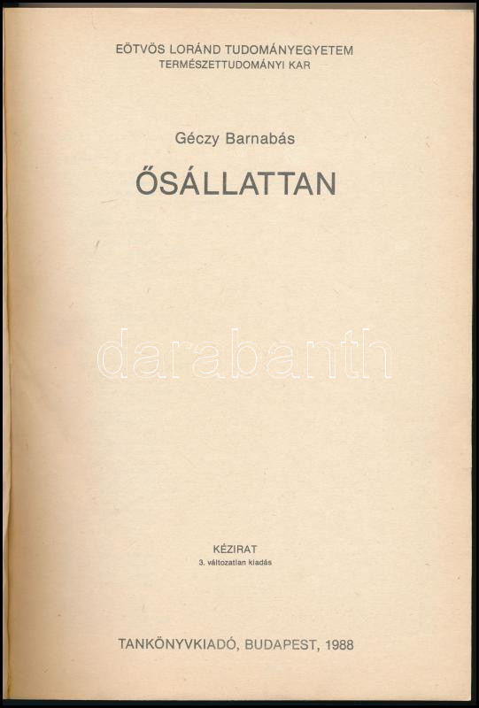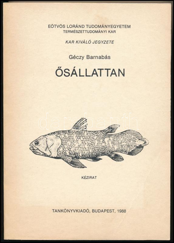 Géczy Barnabás: Ősállattan. Eötvös Loránd Tudományegyetem Természettudományi Kar. (Kézirat). Bp., 1988, Tankönyvkiadó, 453+(1) p. Kiadói papírkötés. Megjelent 127 példányban.