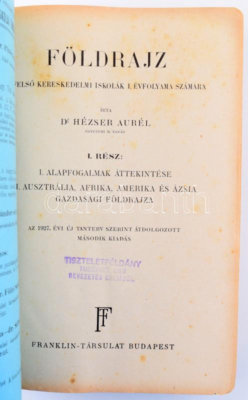 Leírás: Hézser Aurél: Földrajz a felső kereskedelmi iskolák I-IV. évfolyama számára. I-IV. köt. [Egybekötve]. Bp., é.n. (cca 1930), Franklin-Társulat, 199+(1) p.; 198+(2) p.; 142+(2) p.; 131+(1) p. Átkötött papírkötésben, viseltes borítóval, helyenként kissé foltos lapokkal.
