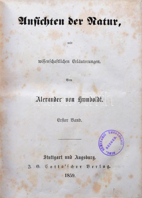 Humboldt, Alexander von: Ansichten der Natur, mit wissenschaftlichen Erläuterungen. Band 1-2. [Egybekötve]. Stuttgart-Augsburg, 1859-1860, J. G. Cotta'scher Verlag, X+262 p.; 294 p. Német nyelven. Aranyozott egészvászon-kötésben, fakó gerinccel, kissé dohos, helyenként foltos lapokkal.