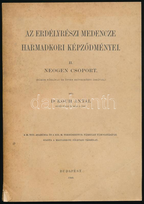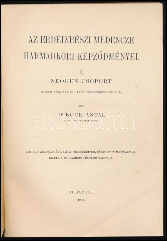 Koch Antal: Az erdélyrészi medencze harmadkori képzÅ‘dményei. II. Neogen csoport. Bp., 1900, Magyarhoni Földtani Társulat (Franklin-ny.), 329+(3) p.+ 3 (szÃnes) t. (ebbÅ‘l 2 kihajtható). Kiadói papÃrkötés, kissé foltos, sérült borÃtóval és gerinccel. (Ritka!)