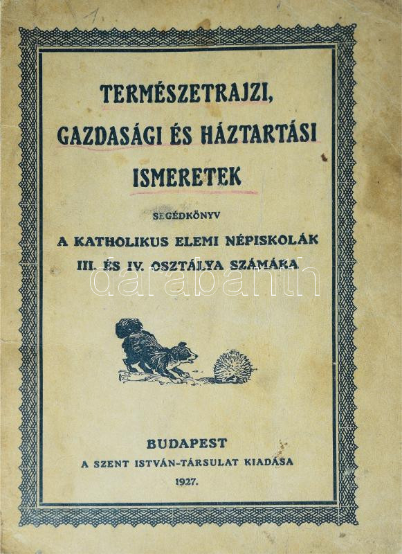 Természetrajzi, gazdasági és háztartási ismeretek. Segédkönyv a katholikus elemi népiskolák III. és IV. osztálya számára. Bp., 1927, Szent István Társulat. Kiadói papírkötés, gerinc sérült, kopottas állapotban.