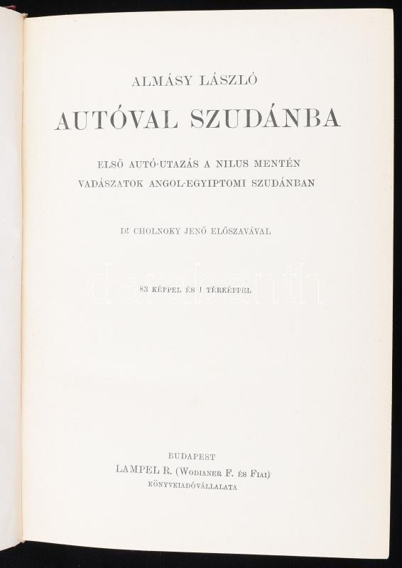 Almásy László: Autóval Szudánba. Első autó-utazás a Nílus mentén. Vadászatok Angol-Egyiptomi Szudánban. Cholnoky Jenő előszavával. A Magyar Földrajzi Társaság Könyvtára. Bp., [1929], Lampel R., 240 p.+ 29 t.+ 1 (kihajtható térkép) t. Kiadói aranyozott egészvászon-kötés, nagyrészt jó állapotban, kissé kopottas borítóval.