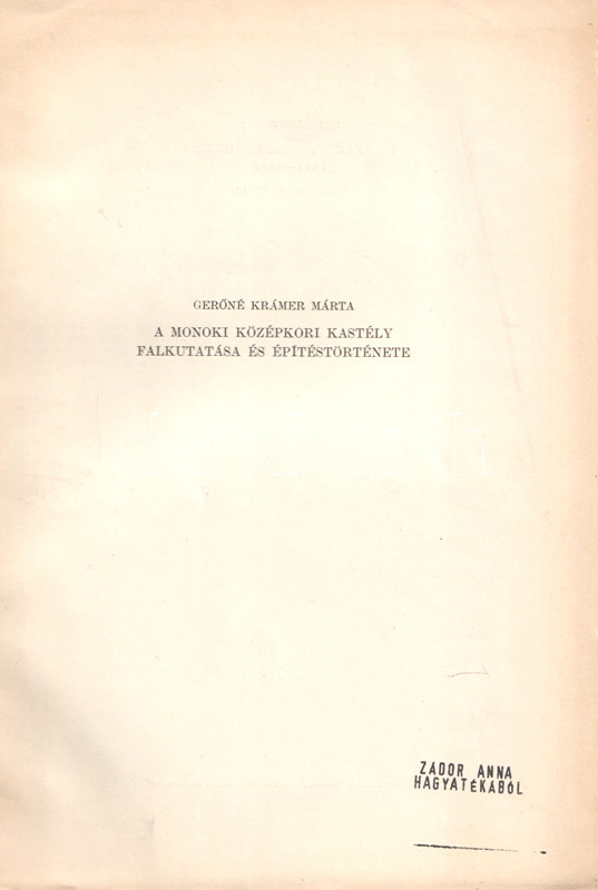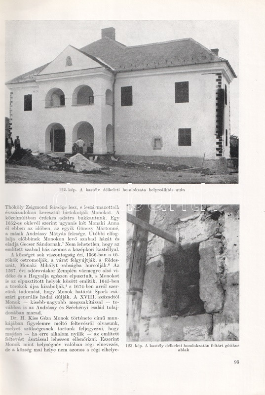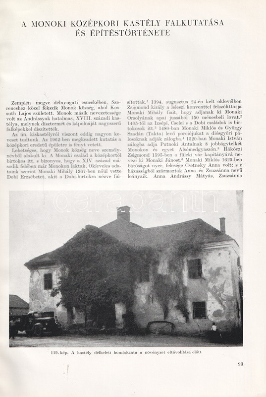 A gazdag szövegközti fotóanyaggal illusztrált tanulmány a késő középkorban alapított, XVI. században felépült, reneszánsz alapokat és a klasszicista átépítés nyomait őrző monoki kiskastély építési és restaurálási történetét mutatja be. Az első borítófedélen hagyatéki bélyegzés, "Zádor Anna hagyatékából" felirattal.