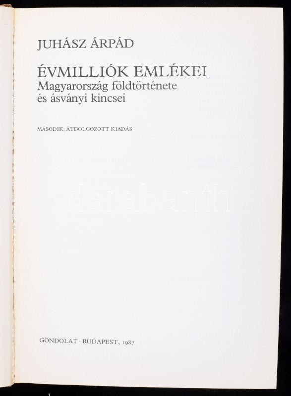 Juhász Árpád: Évmilliók emlékei. Magyarország földtörténete és ásványi kincsei. Bp., 1987, Gondolat, 561+(3) p.+ 52 (fekete-fehér ill. színes fotók) t. Második, átdolgozott kiadás. Kiadói egészvászon-kötés, kissé sérült kiadói papír védőborítóban, több kijáró képtáblával.