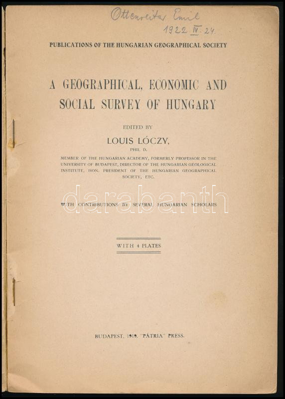 Lóczy, [Lajos] Louis (szerk.): A Geographical, Economic and Social Survey of Hungary. Publications of the Hungarian Geographical Society. Bp., 1919, "Pátria"-ny., 121+(1) p.+ 3 t.+ 1 (kihajtható térkép, Magyarország vasúti térképe) t. Angol nyelven. Kiadói papírkötés, kissé foltos borítóval, sérült gerinccel, a címlapon ceruzás névbejegyzéssel (Ottenreiter Emil).