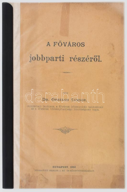 Országh Sándor: A főváros jobbparti részéről. Bp., 1892, Heisler J.-ny., 26 p. Egyetlen kiadás. Modern borítóban, néhány sérült, javított lappal, helyenként kissé foltos.