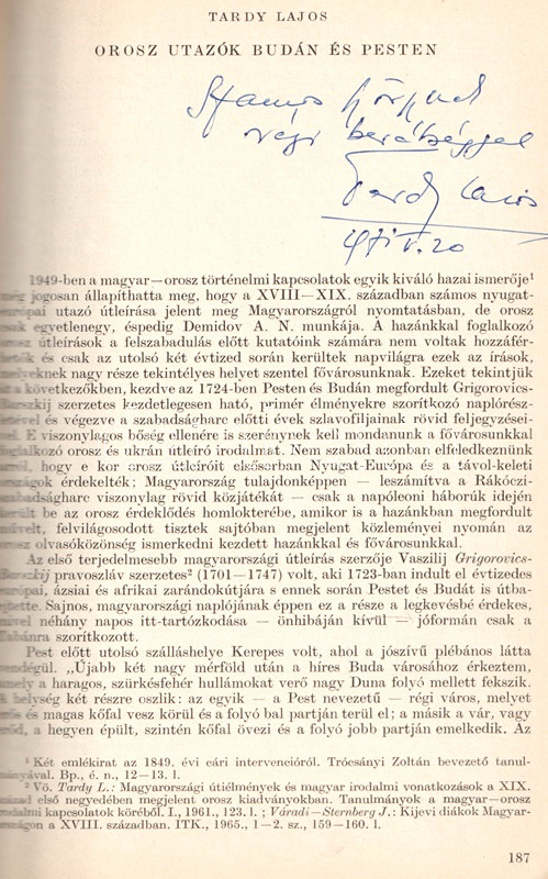 Dedikált: "Szamos Györgynek régi barátsággal: Tardy Lajos. 1971. V. 21".