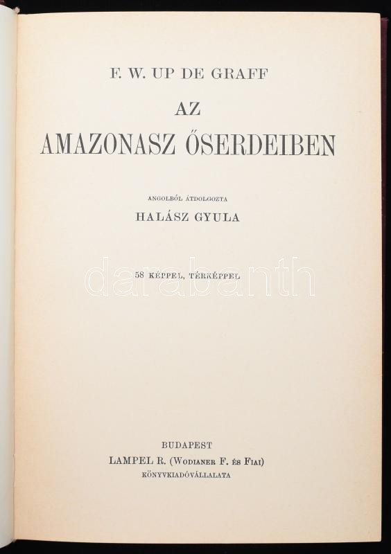 Up de Graff, Fritz W.: Az Amazonasz őserdeiben. Ford.: Halász Gyula. A Magyar Földrajzi Társaság Könyvtára. Bp., [1933], Lampel R., 164+(4) p.+ 29 t. Kiadói aranyozott egészvászon-kötés, kissé viseltes, kopottas borítóval és gerinccel, belül nagyrészt jó állapotban.