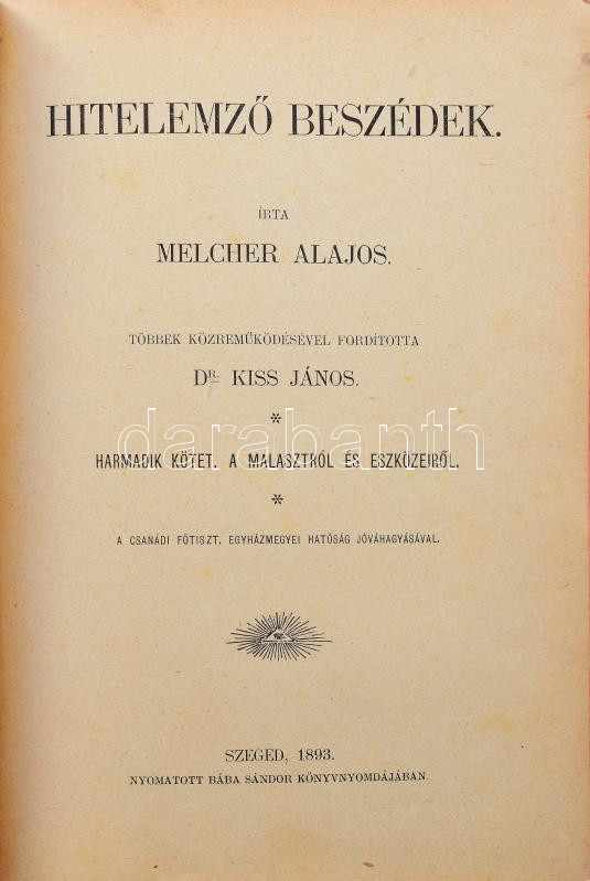 Melcher Alajos: Hitelemző beszédek. III. köt.: A malasztról és eszközeiről Ford.: Dr. Kiss János. Szeged, 1893, Bába Sándor, IV+381 p. Egyetlen kiadás. Kiadói egészvászon kötésben,, kis kopással.