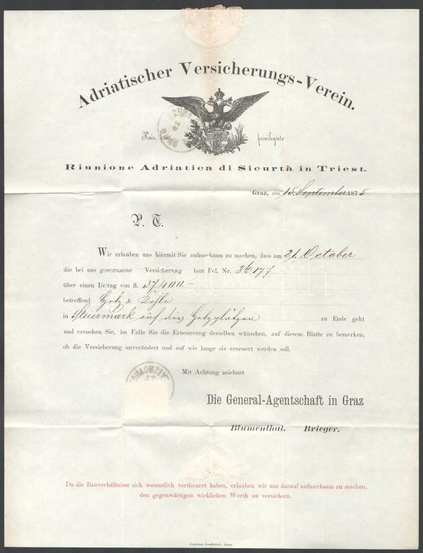 1875 Dekoratív biztosítási nyomtatvány "GRAZ / MURVORSTADT" ... https://www.darabanth.com/hu/504-Gyorsarveres/504.0/Kulfoldi-filatelia-es-postatortenet/Ausztria~3000018/1875-Dekorativ-biztositasi-nyomtatvany-GRAZ-MURVORSTADT-BRUCK-A-D-MUR-BAHNHOF~II3422222