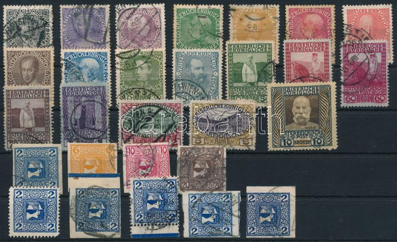 Leírás: 1908 Ferenc József sor krétapapíron Mi 139-156 (156 fakszimile) + Hírlapbélyeg sor + 5 db 2 Heller krétapapíron