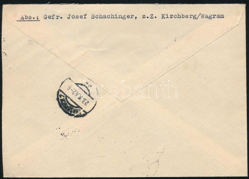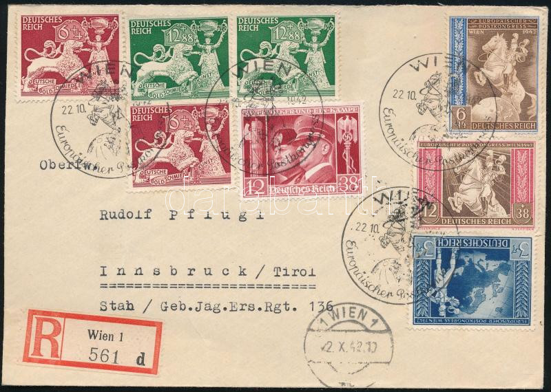 Leírás: Deutsches Reich 1942 Dekoratív ajánlott levél európai postakongresszusi bélyegzésekkel és bélyegekkel, "WIEN" - INNSBRUCK 2"