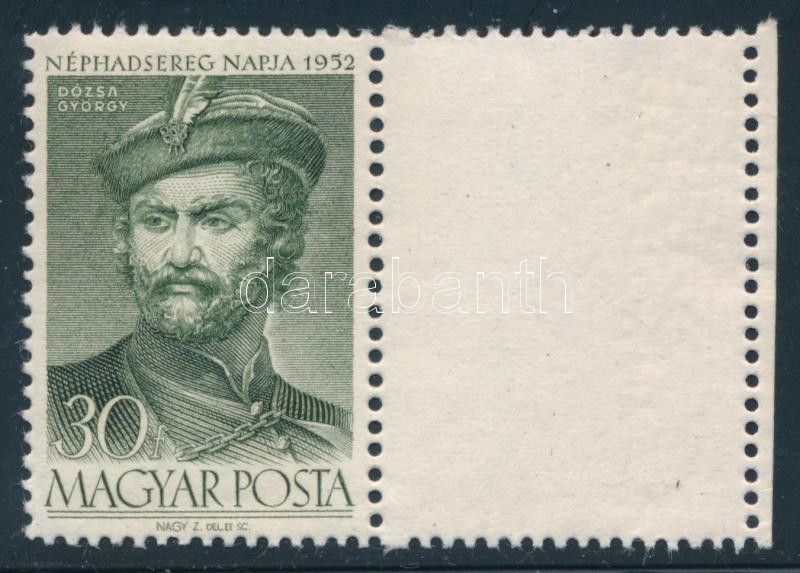 Leírás: 1952 Néphadsereg napja 30f jobb oldali üres mezővel
