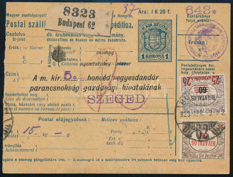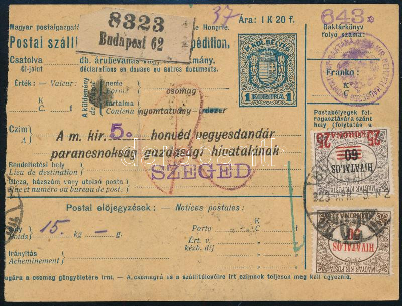 Leírás: 1923 Csomagszállító 12 db Hivatalos bélyeggel kiegészítve Budapestről Szegedre / Parcel card with 12 Official stamps