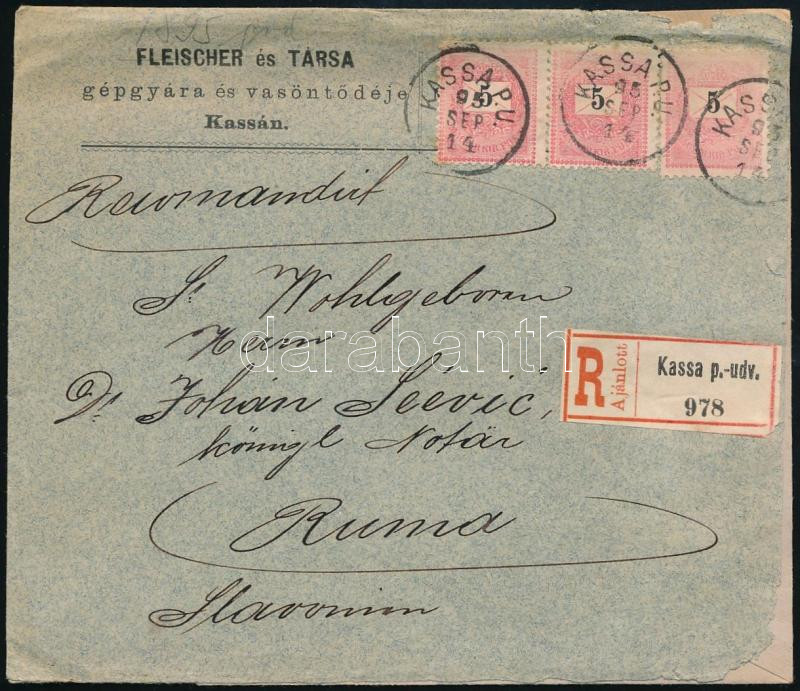 Leírás: 1895 Céges ajánlott levél hátoldali 3x5kr bérmentesítéssel, "KASSA P.U." - Ruma (Árpatarló)