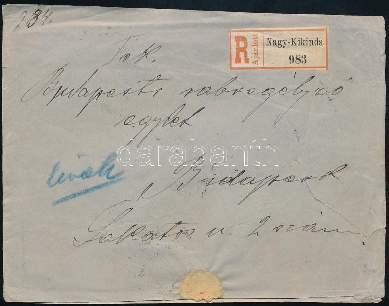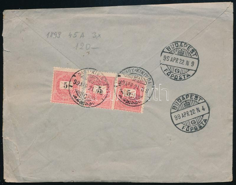 Leírás: 1898 Ajánlott levél hátoldali 3x5kr bérmentesítéssel, "NAGY-KIKINDA" - "BUDAPEST / FŐPOSTA"