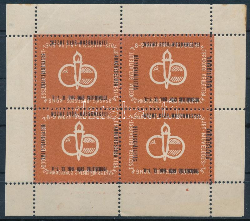 Leírás: 1946 MSZMT Győr-Moson megyei bélyegkiállítás emlékív (saroktörés, rozsda / folded corner, stain)