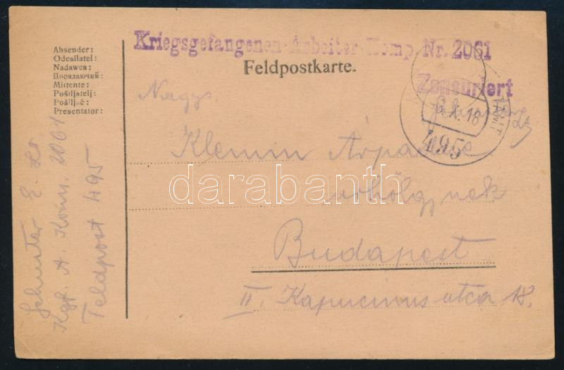 1918 Hadifogolylap "Kriegsgefangenen-Arbeiter Komp. Nr. 2061"... https://www.darabanth.com/hu/504-Gyorsarveres/504.0/Magyar-filatelia-es-postatortenet/I-Vilaghaborus-osztrak-magyar-tabori-posta-Hadifogoly-kuldemenyek~500043/1918-Hadifogolylap-Kriegsgefangenen-Arbeiter-Komp-Nr-2061-plus-FP-495~II3422548