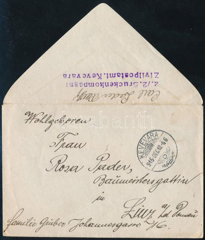 1915 Levél Keveváráról "2/2 Bruckenkompagni Zivilpostamt Kevevára... https://www.darabanth.com/hu/504-Gyorsarveres/504.0/Magyar-filatelia-es-postatortenet/I-Vilaghaborus-osztrak-magyar-tabori-posta~500039/1915-Level-Kevevararol-22-Bruckenkompagni-Zivilpostamt-Kevevara-Linz~II3425177