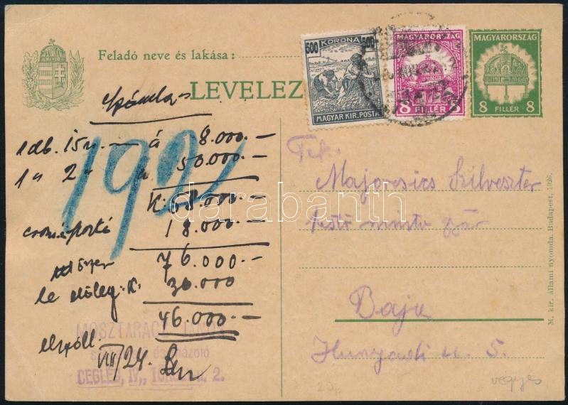 Leírás: 1926 8f díjjegyes levelezőlap vegyes 500K és 8f díjkiegészítéssel Ceglédről Bajára