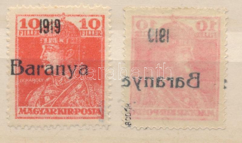 Leírás: Baranya I. 1919 2 db Károly 10f, az egyik a felülnyomás gépszínátnyomatával, Bodor vizsgálójellel