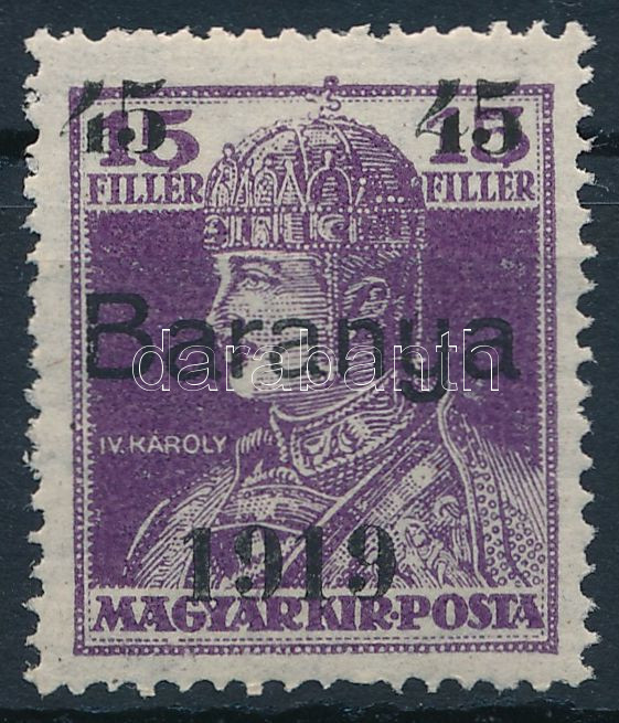Baranya I. 1919 Károly 45f/15f próbanyomat / Mi VII. proof. Signed: Bo... https://www.darabanth.com/hu/504-Gyorsarveres/504.0/Magyar-filatelia-es-postatortenet/Megszallasi-es-helyi-kiadasok-1919-1921-garanciaval~500045/Baranya-I-1919-Karoly-45f15f-probanyomat-Mi-VII-proof-Signed-Bodor~II2990636