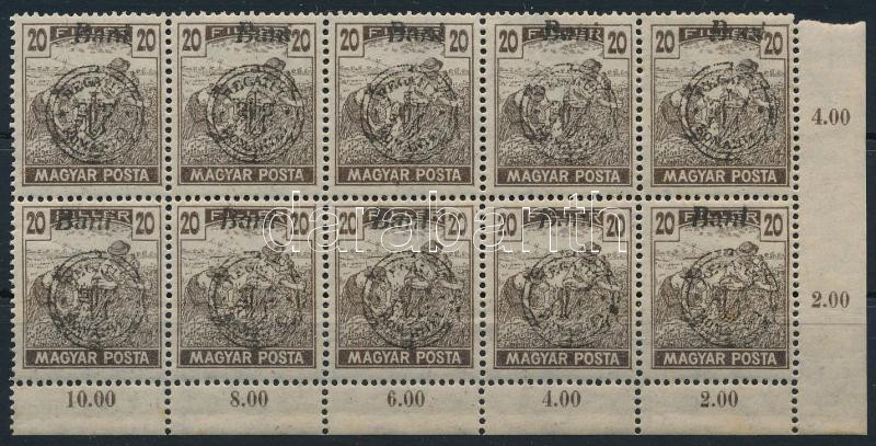 Leírás: Nagyvárad 1919 Magyar Posta 20f 10-es tömb erősen hiányos felülnyomással, Bodor vizsgálójellel (ránc / crease)