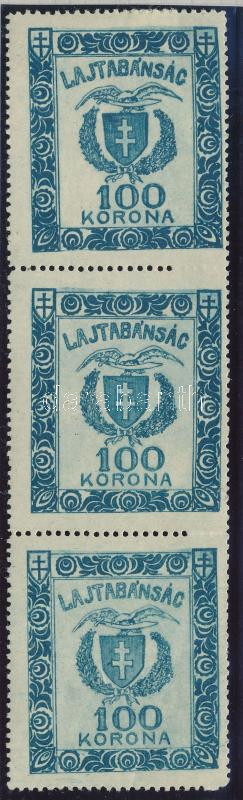 Leírás: Nyugat-Magyarország VII. 1921 100K függőleges hármascsík, részben hiányzó fogazással, 1 bélyeg falcos, Bodor vizsgálójellel
