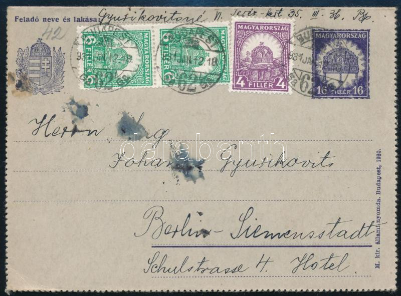 Leírás: 1931 Díjjegyes zárt levelezőlap 3 bélyeges kiegészítéssel Budapestről Berlinbe