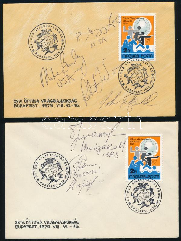 1979 Az amerikai és a szovjet öttusa csapat tagjainak aláírásai 2 darab XXIV. Öttusa VB Budapest FDC-n. /Autograph signatures of american and soviet pentathletes at the 1979 Word Championships