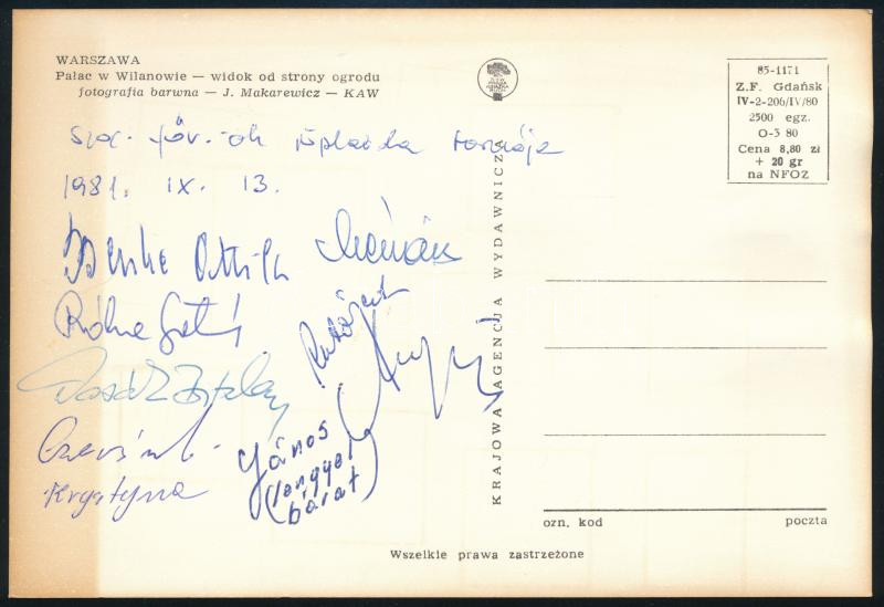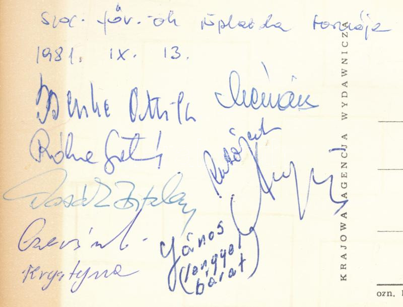 Leírás: 1981 Magyar és lengyel röplabdázók által aláírt képeslap röplabda tornáról