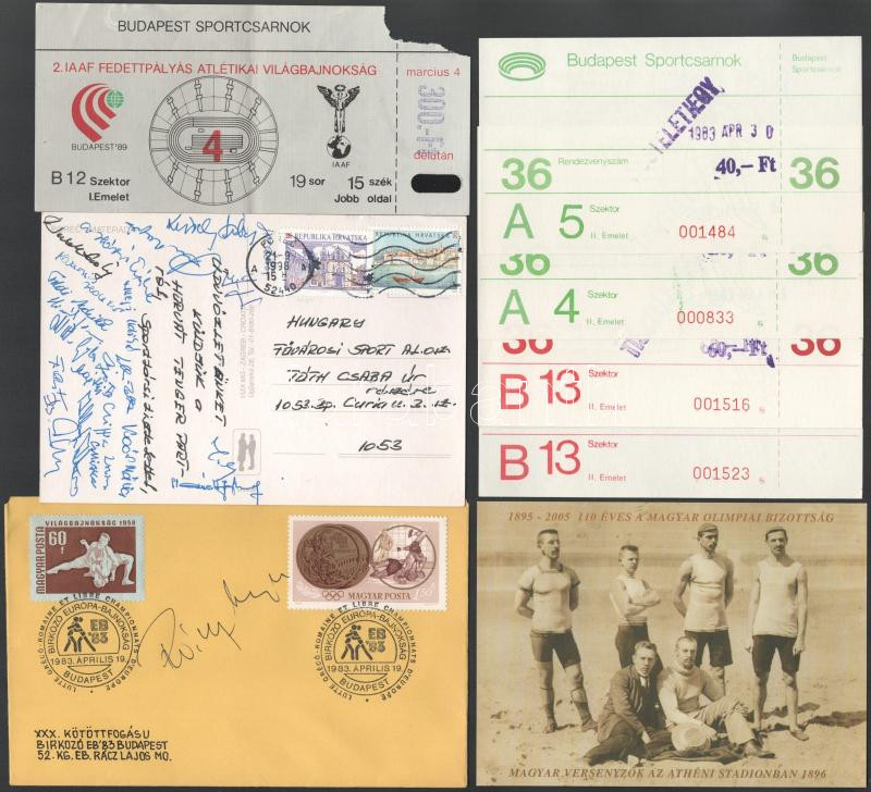 Leírás: 1983-1998 Sport tétel: Bírkózó EB aláírt boríték, magyar röplabdázók aláírt képeslapja, Atlétika EB belépő, tornász EB tiszteletjegyek
