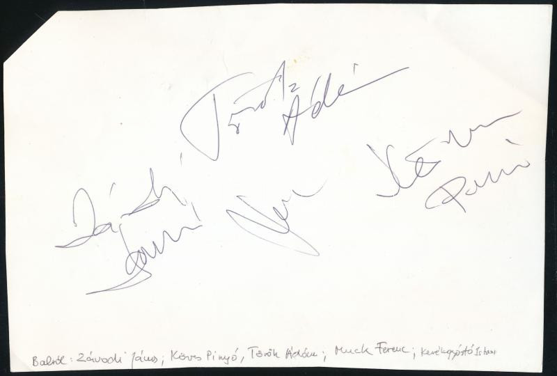 Leírás: Török Ádám, Muck Ferenc, Závodi Janó, Köves Pinyó, Kerékgyártó István aláírása fotó hátoldalán