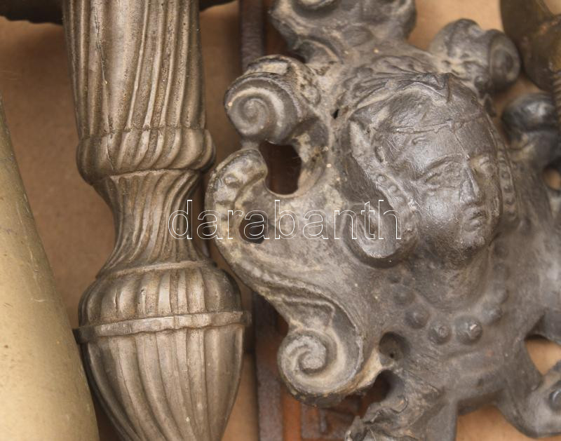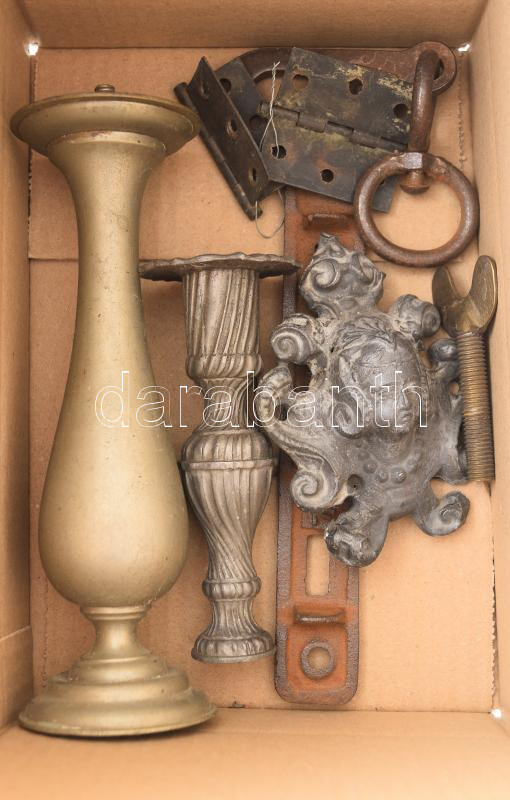 Leírás: Doboznyi vegyes régi fém tárgy tétel, közte maszkos bútordísz